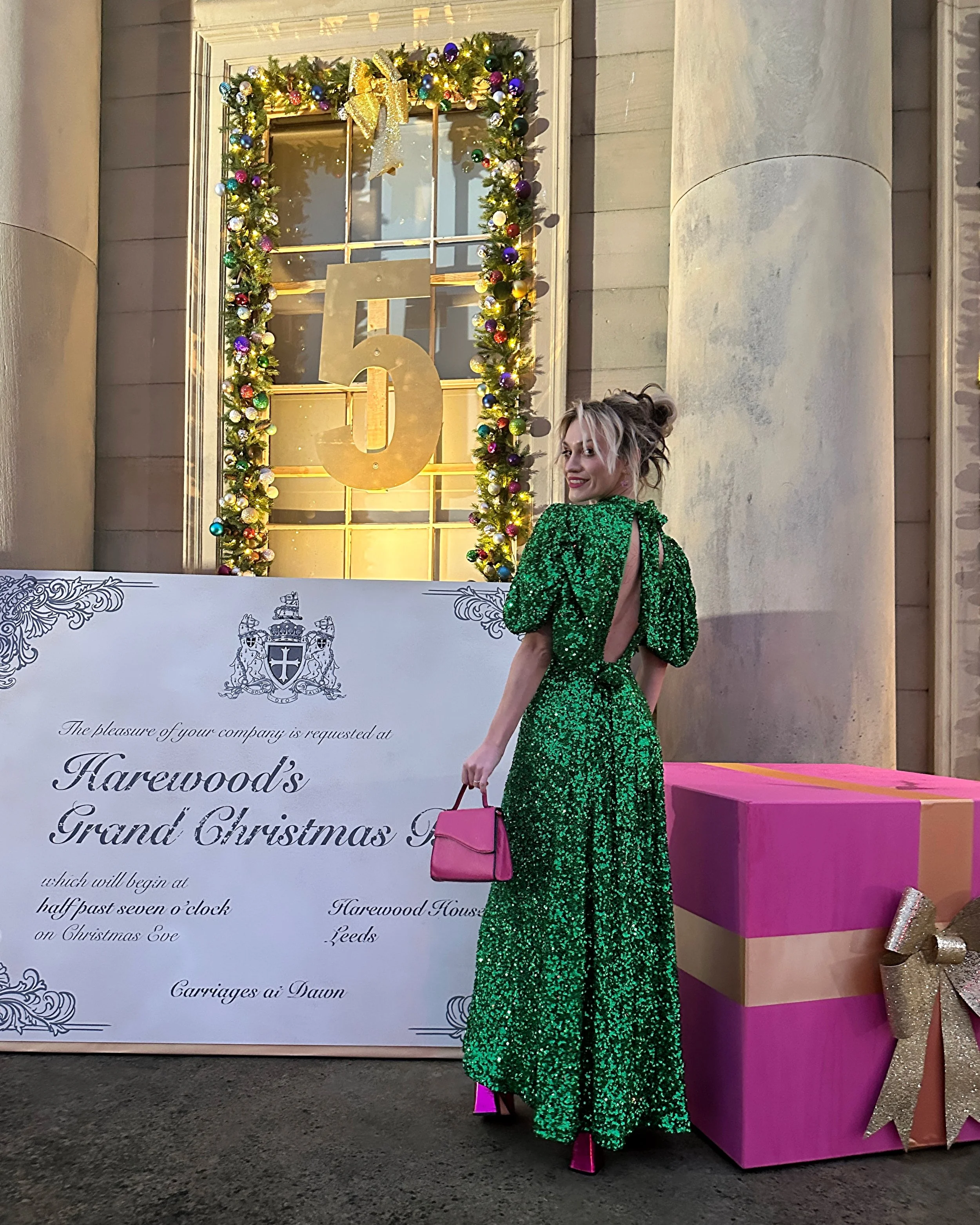 Morgan wears our ROTATE Christensen Birger green sequin dress, at renowned designer Siobhan Murphyās launch of her curated exhibition at Harewood Houseās: A Glittering Invitation: Christmas at Harewood
